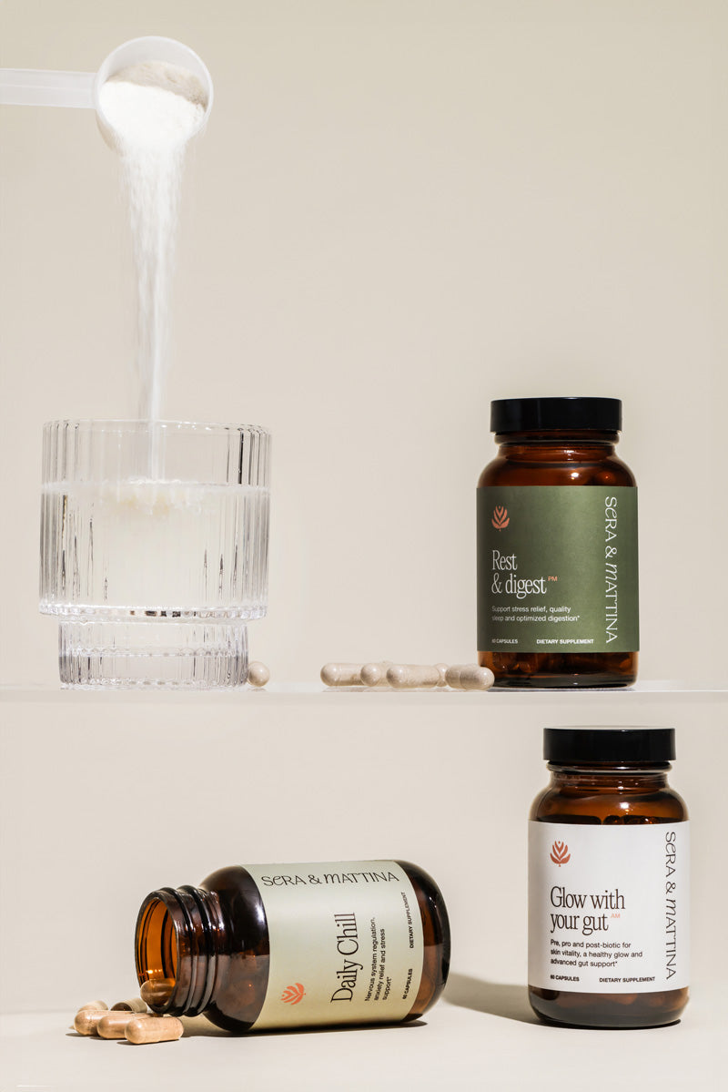 Every ingredient we use in our products has been clinically studied and formulated with a dosage proven to work. Sera & Mattina skin and gut supplements have been designed to simplify your wellness by making it easy and seamless to create healthy habits and see healthy results.