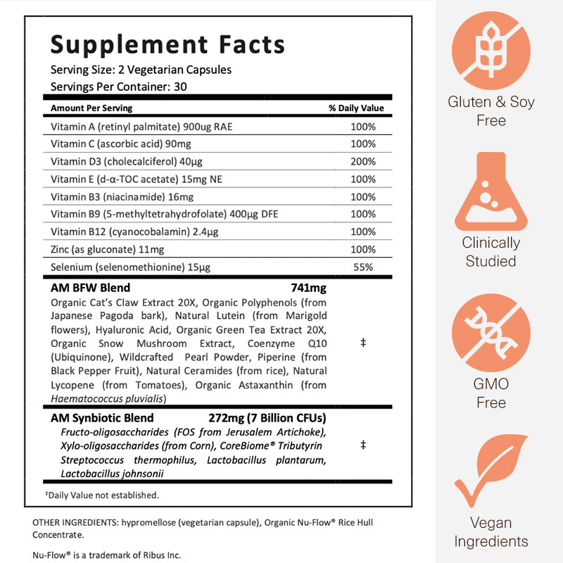 Our capsules include morning BFW, a bioavailable blend, and antioxidants such as astaxanthin, organic cat's claw, vitamin C and vitamin E to protect cell health, smooth the skin and enhance collagen production. Hyaluronic acid & ceramides support hydration and skin clarity, and organic pearl powder & organic snow mushroom strengthen hair, skin, and nails.